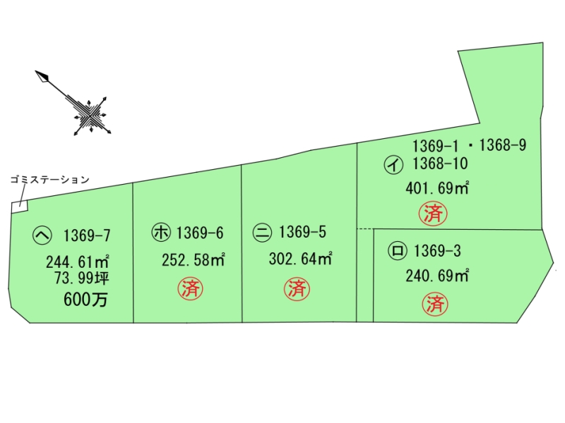 - 電気:小売電気事業者 ガス:LPG 上水道:公営(各区画引込済) 排水:合併浄化槽(敷地内浸透)