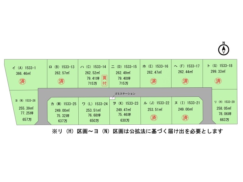 ・リ(H)区画~ヨ(N)区画は公拡法に基づく届け出を必要とします。